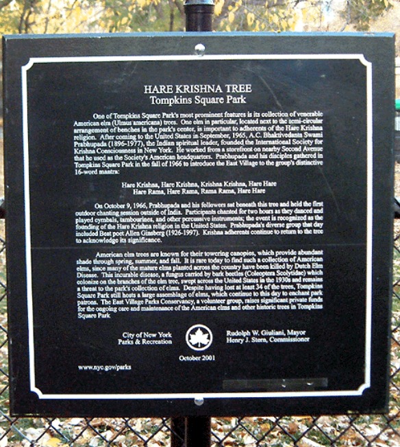 Srila Prabhupada chanting in New York.Current sign on the tree he stood under, marking history: